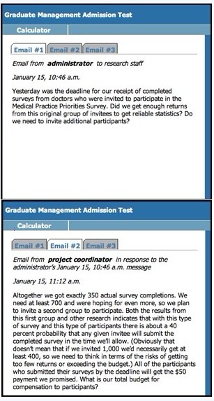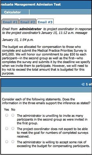 题型描述:页面左方有两或三个选项卡,其中有不同种类或相同种类的各种信息。页面右方是关于这些信息的一个或多个问题。此题型考查考生从不同数据来源中获取最相关信息数据的能力、结合不同种类的数据解决问题的能力。