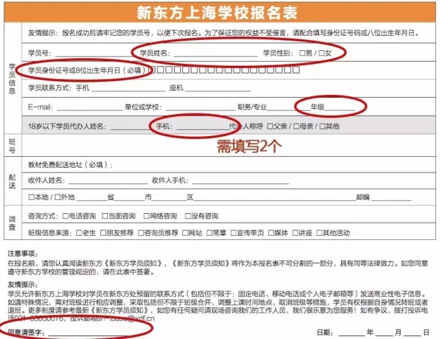1、填写报名表(提供姓名、性别、年级、身份证号或出生年月日、联系电话2个),阅读报名须知(签字)。下图信息(特别是圆圈标注处)都可以提前准备哦!