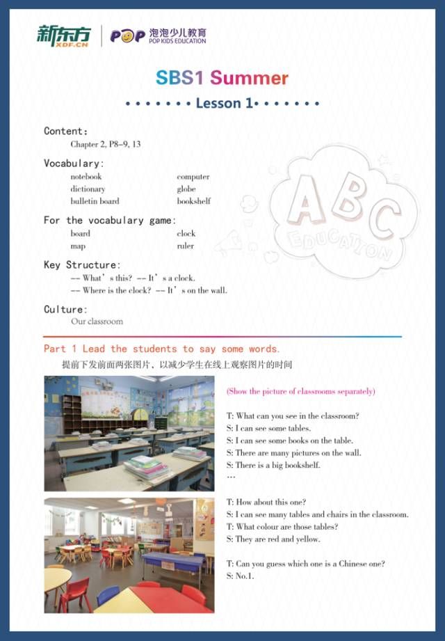 以暑假第一次课的预习材料为例,资料的第一部分显示了线上课将会巩固的线下课堂词汇及关键句型,以便学员在课前及时复习单词的发音,词形以及句型的使用。
