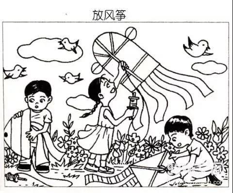 小王把它的风筝放的很高,小兰也把风筝放了起来,小明、小红、小绿的运气不好,他们的风筝都被几只小鸟给挂到了树上拿不下来了,小红很聪明,她拿出鱼网捉昆虫,小明、小绿也不等, 跟着小王和小兰一起跑。