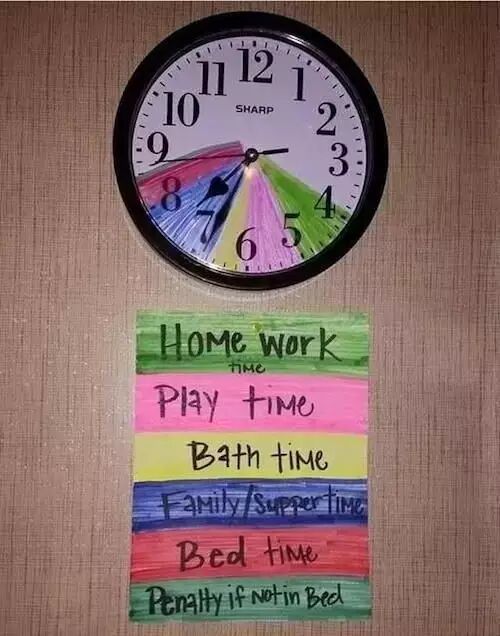 或许对于小孩子,时间观念还不是特别强,那么咱们可以DIY一个时钟,把计划和时间用颜色紧密地关联在一起: