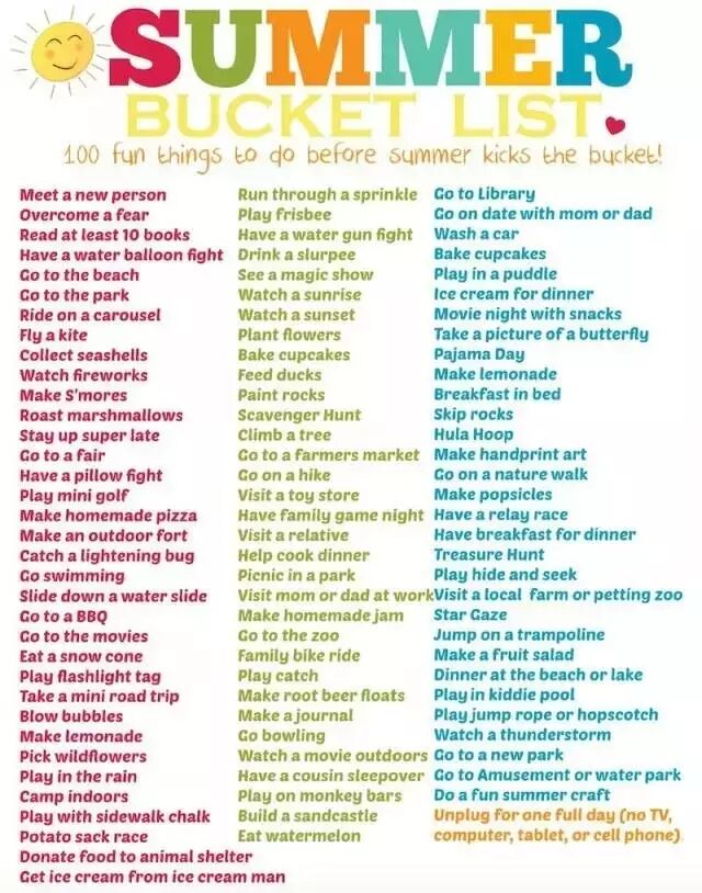 比如放个风筝,读至少10本书,认识一个新朋友,做柠檬水,来一次旅行、在石头上涂色、做个沙拉等等 …