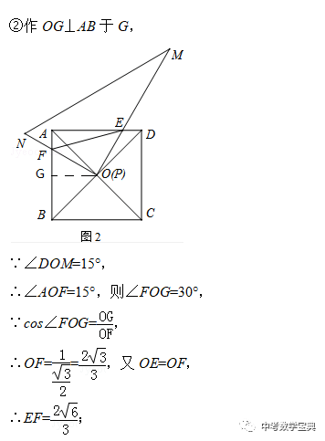 ②如图2,在旋转过程中,当∠DOM=15°时,连接EF,若正方形的边长为2,请直接写出线段EF的长;