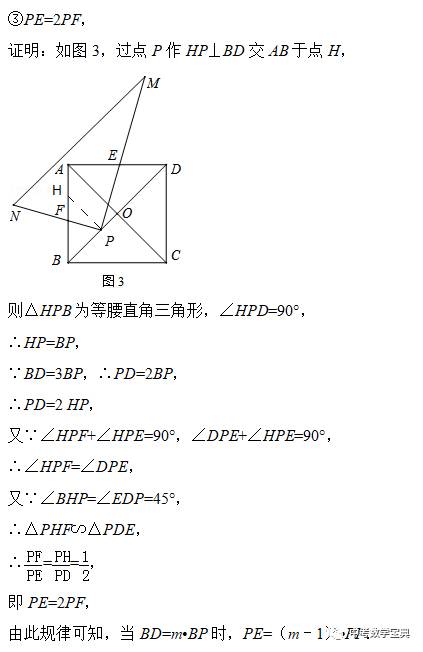 ③如图3,旋转后,若Rt△PMN的顶点P在线段OB上移动(不与点O、B重合),当BD=3BP时,猜想此时PE与PF的数量关系,并给出证明;当BD=m•BP时,请直接写出PE与PF的数量关系.
