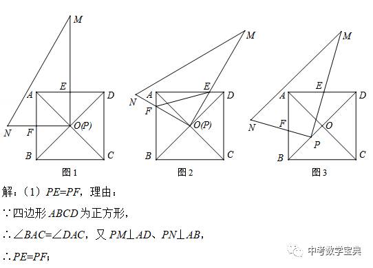 (1)如图1,若点P与点O重合且PM⊥AD、PN⊥AB,分别交AD、AB于点E、F,请直接写出PE与PF的数量关系;