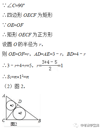 (2)图2,先求斜边上的高CD的长,再由勾股定理求出AD和BD,利用半径r=(a+b-c)/2(a、b是直角边,c为斜边)求两个圆的半径,从而求出两圆的面积和=π;