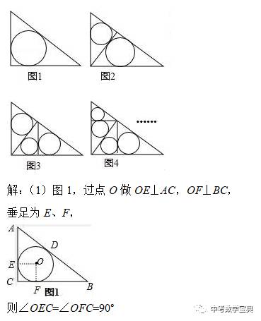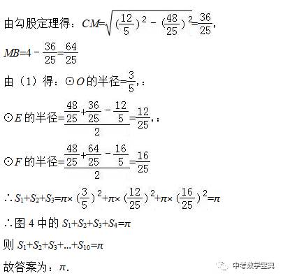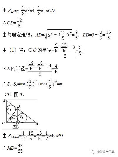 (3)图3,继续求高DM和CM、BM,利用半径r=(a+b-c)/2(a、b是直角边,c为斜边)求三个圆的半径,从而求出三个圆的面积和=π;