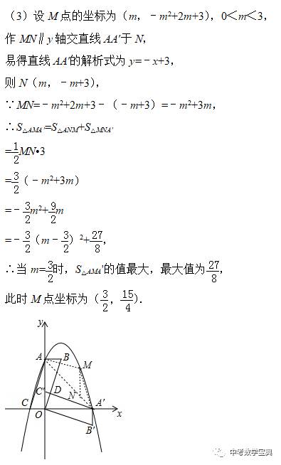 (3)根据二次函数图象上点的坐标特征,设M点的坐标为(m,﹣m2+2m+3),0<m<3,作MN∥y轴交直线AA′于N,求出直线AA′的解析式为y=﹣x+3,则N(m,﹣m+3),于是可计算出MN=﹣m2+3m,再利用S△AMA′=S△ANM+S△MNA′和三角形面积公式得到S△AMA′=﹣3/2m2+9/2m,然后根据二次函数的最值问题求出△AMA′的面积最大值,同时刻确定此时M点的坐标.
