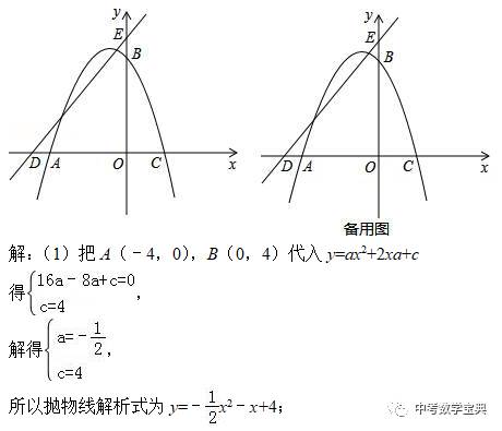 如图,在平面直角坐标系中,O为坐标原点,抛物线y=ax2+2xa+c经过A(﹣4,0),B(0,4)两点,与x轴交于另一点C,直线y=x+5与x轴交于点D,与y轴交于点E.