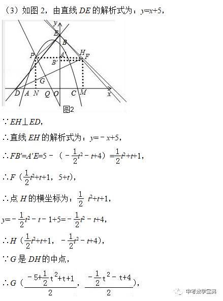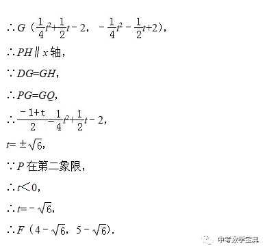 (3)如图2,根据直线EH的解析式表示出点F的坐标和H的坐标,发现点P和点H的纵坐标相等,则PH与x轴平行,根据平行线截线段成比例定理可得G也是PQ的中点,由此表示出点G的坐标并列式,求出t的值并取舍,计算出点F的坐标。