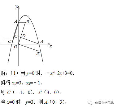 (1)利用抛物线与x轴的交点问题可求出C(﹣1,0),A′(3,0);计算自变量为0时的函数值可得到A(0,3);