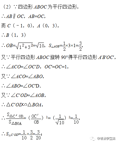 (2)先由平行四边形的性质得AB∥OC,AB=OC,易得B(1,3),根据勾股定理和三角形面积公式得到OB的值,S△AOB=3/2,再根据旋转的性质得∠ACO=∠OC′D,OC′=OC=1,接着证明△C′OD∽△BOA,利用相似三角形的性质得S△C’OD/S△BOA=(OC’/OB)2,则可计算出S△C′OD;