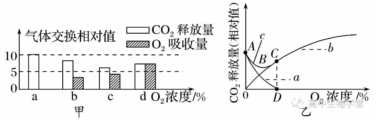 判断依据为甲中a及乙中A点时无O2消耗,应只进行无氧呼吸,甲中d及乙中C点后,O2吸收量与CO2释放量相等,应只进行有氧呼吸,甲中b、c及乙中AC段CO2释放量大于O2吸收量,故除有氧呼吸外,还应存在无氧呼吸。