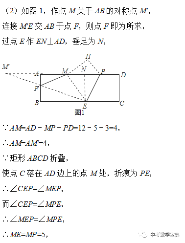 (2)如图1,作点M关于AB的对称点M′,连接M′E交AB于点F,利用两点之间线段最短可得点F即为所求,过点E作EN⊥AD,垂足为N,则AM=AD﹣MP﹣PD=4,所以AM=AM′=4,再证明ME=MP=5,接着利用勾股定理计算出MN=3,所以NM′=11,然后证明△AFM′∽△NEM′,则可利用相似比计算出AF;