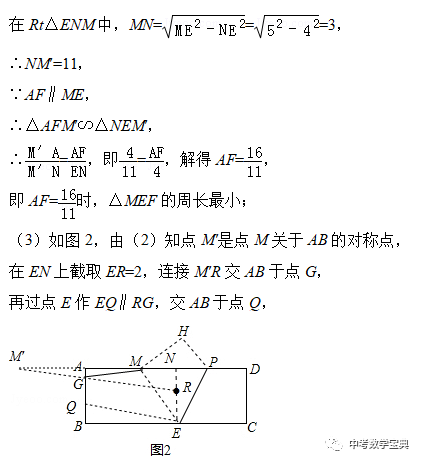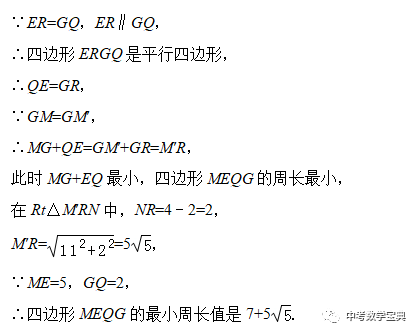 (3)如图2,由(2)知点M′是点M关于AB的对称点,在EN上截取ER=2,连接M′R交AB于点G,再过点E作EQ∥RG,交AB于点Q,易得QE=GR,而GM=GM′,于是MG+QE=M′R,利用两点之间线段最短可得此时MG+EQ最小,于是四边形MEQG的周长最小,在Rt△M′RN中,利用勾股定理计算出M′R的值,就可以求得四边形MEQG的最小周长值。