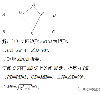 (1)根据折叠的性质和矩形性质以得PD=PH=3,CD=MH=4,∠H=∠D=90°,然后利用勾股定理可计算出MP=5;