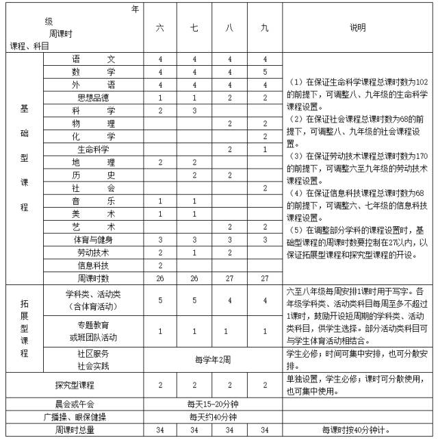 三、初中各年级每周课时总量为34节,每节课的时间按40分钟计。为减轻学生过重的课业负担,学校安排学生在校课堂教学时间不得突破规定的周课时总量。