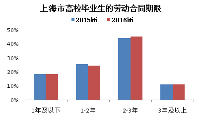 统计数据显示,上海市2016届高校毕业生与用人单位签订的劳动合同,平均期限为29.2个月;其中,劳动合同期限在两年及以上的毕业生约占56.7%。与2015届高校毕业生的情况相比,2016届高校毕业生的平均劳动合同期限增长了0.4个月,高校毕业生与用人单位的劳动合同期限总体呈现增长趋势。