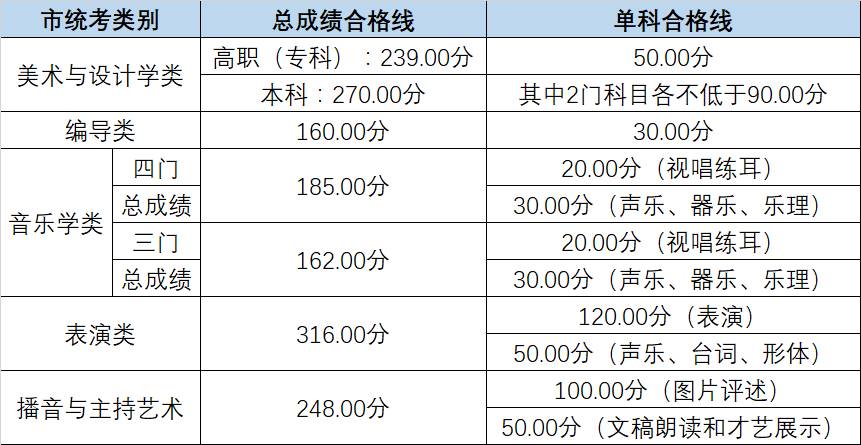 独立设置的本科艺术院校可自行划定本校艺术类本科专业分数线和文化分数线(点击阅读原文可查看今年的分数线)。其他艺术类本科院校(专业)文化控制分数线不低于本科录取控制分数线的65%,2017年上海高考艺术类专业统一考试合格线如下:
