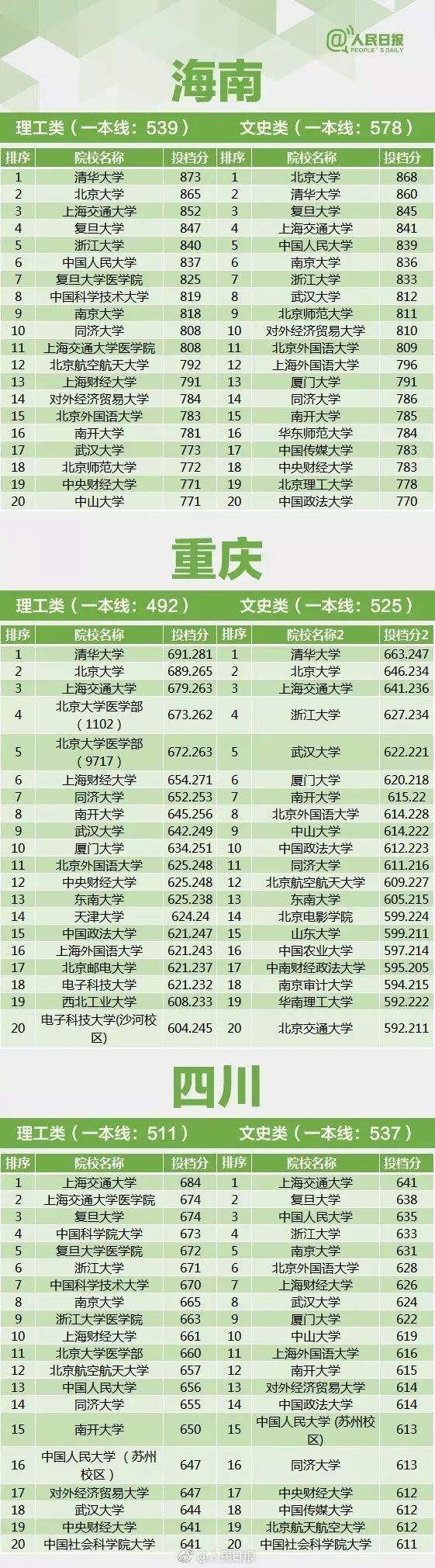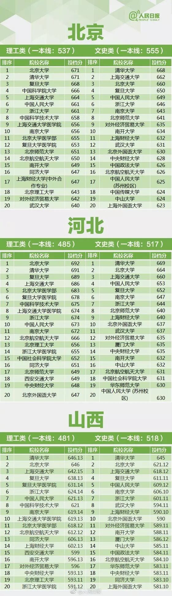 2、人民日报所整理的26省份投档线排名,清华和北大并未出现在上海和四川的榜单之中,为便于对上海交通大学和四复旦大学第三名次数的统计,我们自动将清华北大补为第一名和第二名。