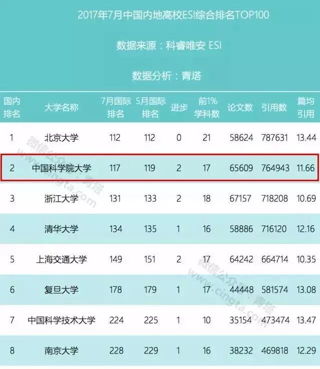 从ESI综合排名中,中国科学院大学位居全球117名,国内第2名,仅次于北京大学。