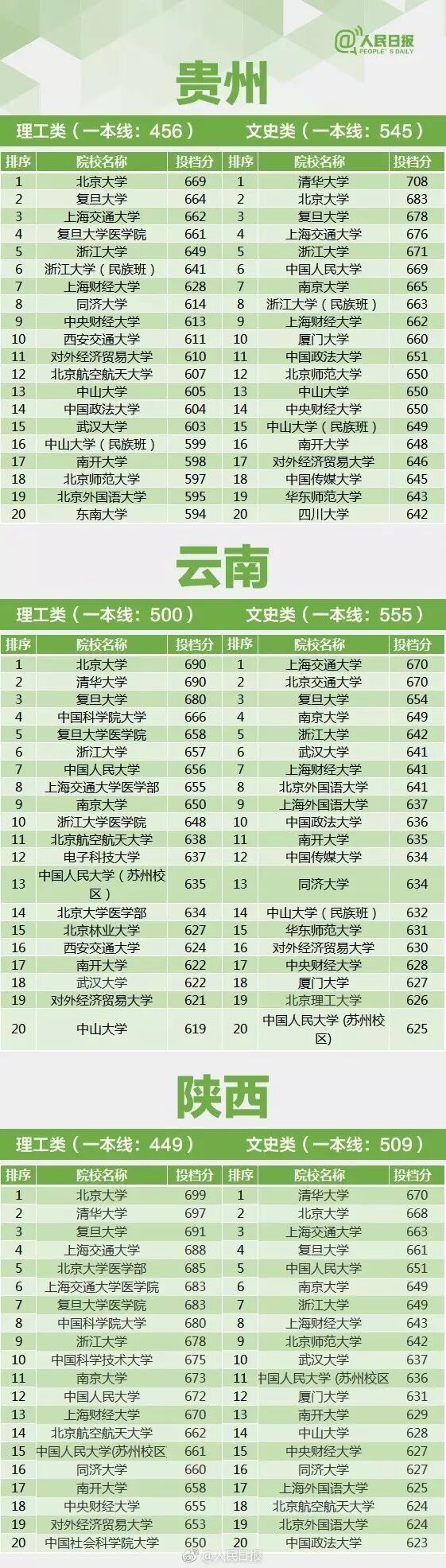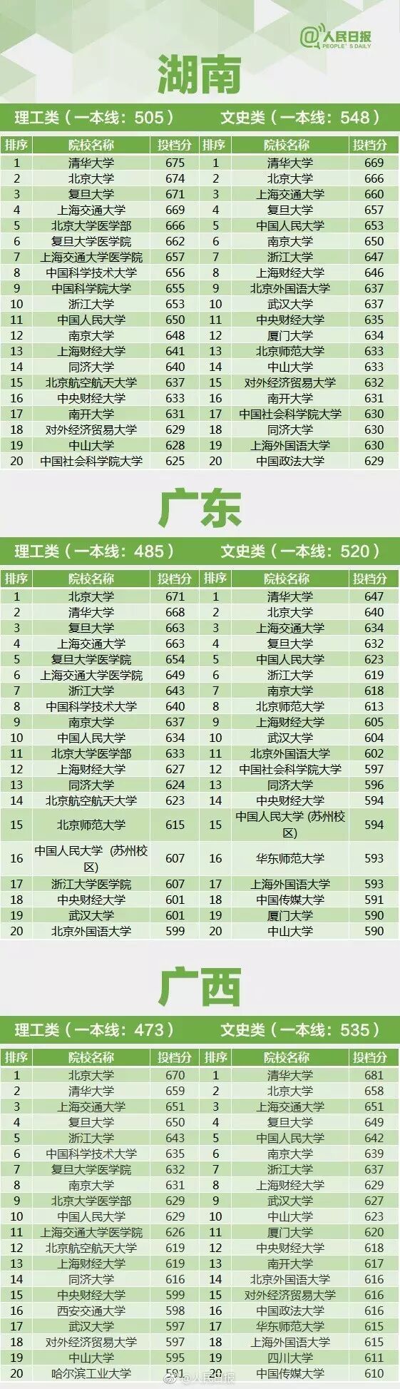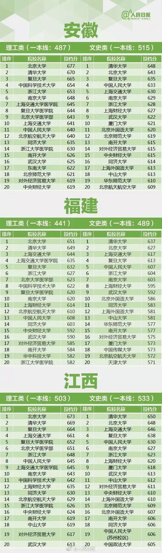 近日,人民日报官方微博整理了除吉林、内蒙古、青海、西藏等之外的全国26个省、直辖市、自治区的高考招生一批次的投档分数线排名。