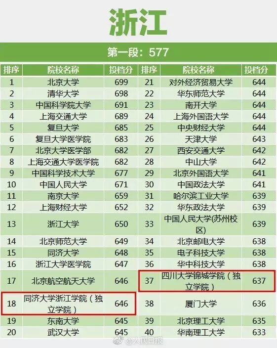理想岛在观察今年浙江省的高招投档线时发现,有两个独立学院的投档线高于985高校投档线。其中,同济大学浙江学院以646分的高分位居浙江省第一段投档线18名,高于武汉大学、南开大学、中山大学、华中科技大学、厦门大学等老牌985;四川大学锦城学院以637分位居投档线37名,也高于厦门大学和北京理工大学。