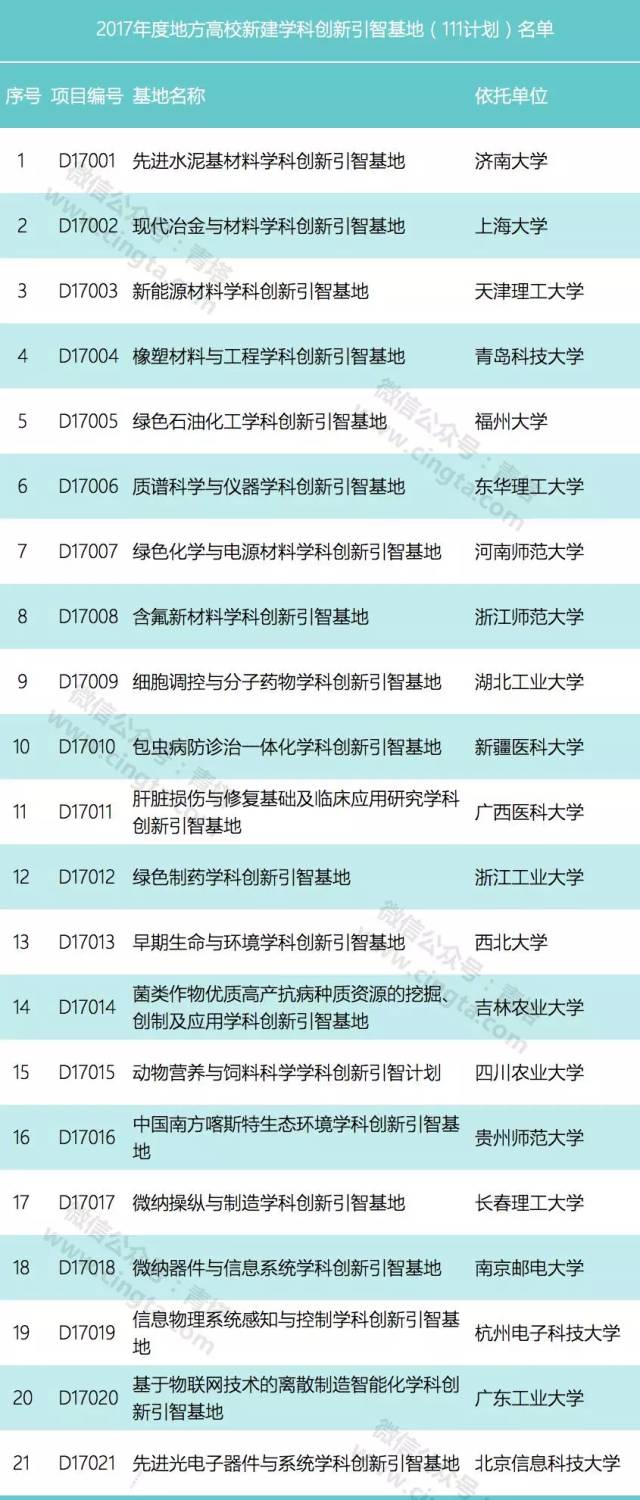 继2016年后,2017年共有21所地方高校入选111计划,入选高校基本都是实力强劲的省属重点大学,包括济南大学、上海大学、天津理工大学、青岛科技大学、福州大学、东华理工大学、河南师范大学、浙江师范大学、湖北工业大学、新疆医科大学、广西医科大学、浙江工业大学、西北大学、吉林农业大学、四川农业大学、贵州师范大学、长春理工大学、南京邮电大学、杭州电子科技大学、广东工业大学、北京信息科技大学等。 其中,上海大学、福州大学、浙江师范大学和浙江工业大学四所高校本次是第二次入选111计划。