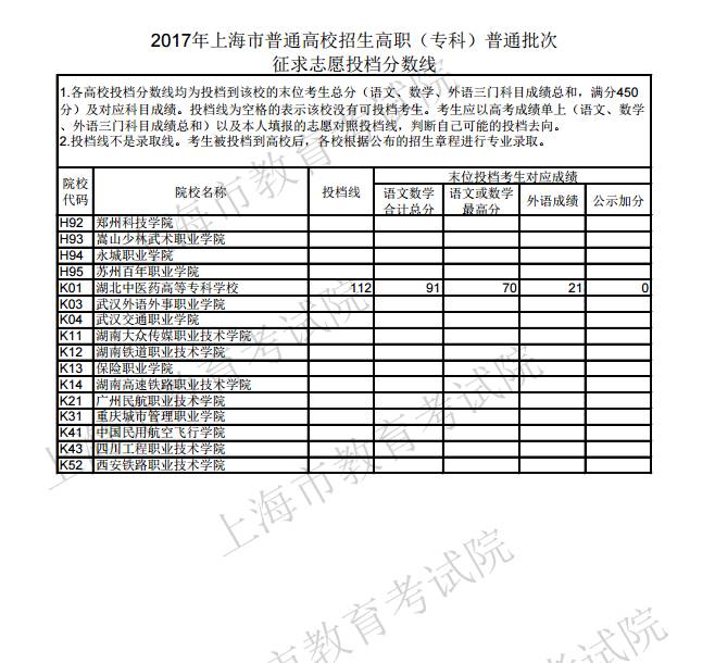 2017上海市普通高校招生高职(专科)普通批次征求志愿投档分数线