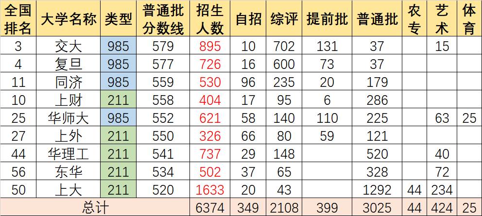 全国985/211高校总计在上海招生约8000人,其中3/4的招生计划在本地的9所高校。(招生计划共分为:自招、综评、提前批、普通批、农村专项、艺术类、体育类)