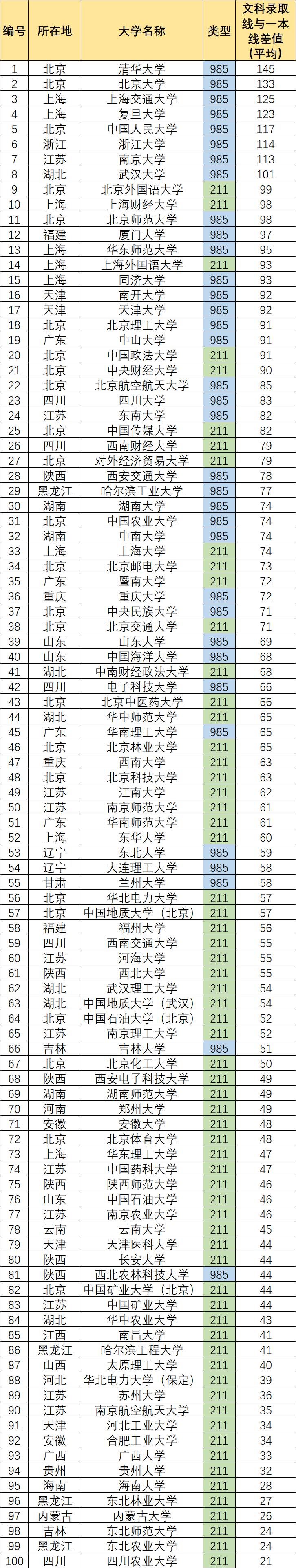 最后附上全国高校文科录取分数线排名表: