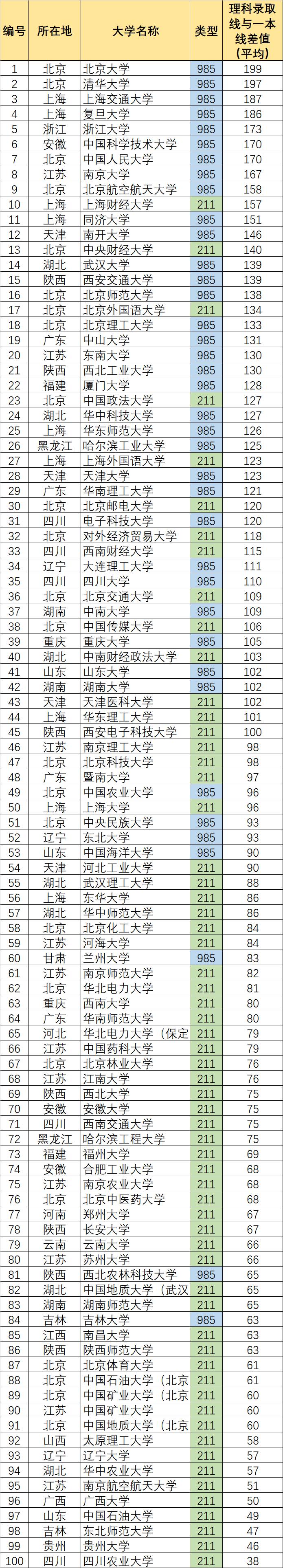 排名参考各重点高校在不同省份的录取分数线与当地本一线的差值。文科高校排名在文末。